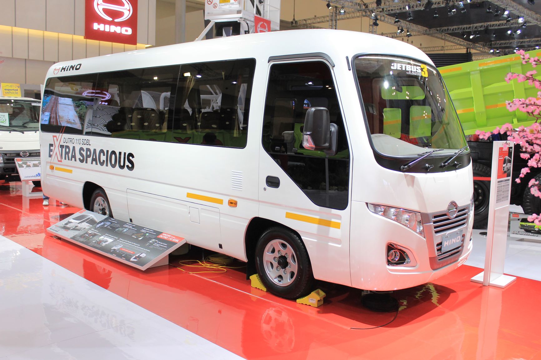 Selain menampilan spesial purpose vehicle seperti truk hydrant dispenser untuk pengisian avtur persawat. Hino turut juga menampilkan Microbus 110 SDBL, kendaraan yang diperuntukan dalam menunjang kebutuhan transportasi dan pariwisata. Hino microbus ini memiliki manuver yang lincah dan mampu menjangkau tempat wisata yang memiilki jalan akses yang sempit. Hino Dutro 110 SDBL kini hadir dengan bodi yang jumbo untuk menambah kenyamanan bagi penumpang karena jarak antar tempat duduk dapat diatur lebih luas sehingga penumpang tidak mudah lelah selama perjalanan. Dengan dimensi rangka lebih panjang membuat kapasitas penumpang menjadi lebih banyak hingga 19 tempat duduk. Selain itu dengan rangkanya yang panjang membuat karoseri dapat mendesain bodi bus dengan bagasi yang lebih luas dan ini menjadi solusi terbaik untuk transportasi terutama untuk pariwisata dalam mengangkut barang – barang wisatawan yang banyak, dimana kapasitas bagasi dapat diisi sampai 21 koper yang berukuran sesuai dengan yang diperbolehkan dalam kabin pesawat. Menggunakan mesin W04D-TP, Hino Dutro 110 SDBL dilengkapi juga dengan stabilizer depan yang membuat kendaraan lebih stabil saat bermanuver sehingga menambah kenyamanan saat di kendaraai. Selain itu pada sisi ban untuk model 110 SDBL juga sudah menggunakan ban radial dengan spesifikasi terbaru yang cocok dalam menunjang operasional bisnis angkutan dan menjadi pilihan utama pelanggan.