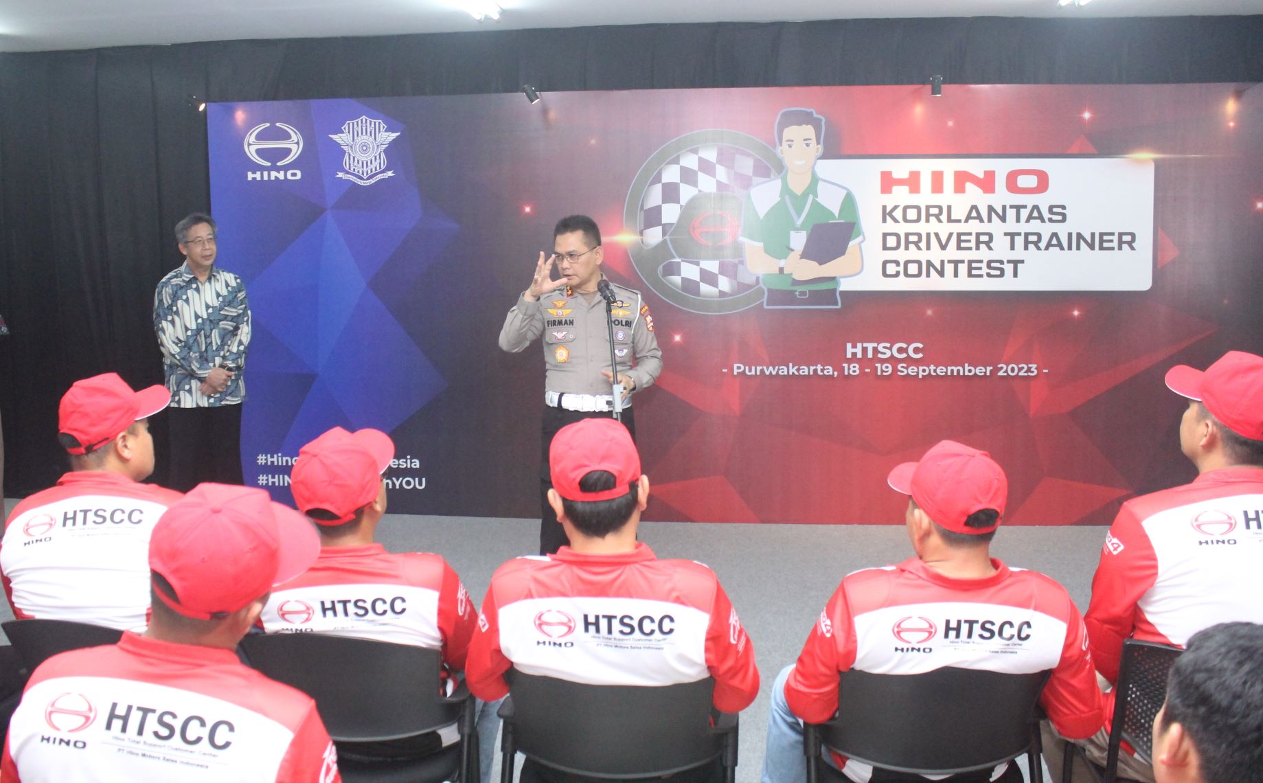 Purwakarta – 19 September 2023.  ­­– PT Hino Motors Sales Indonesia (HMSI) dan Korps Lalu Lintas Kepolisian Negara Republik Indonesia (Korlantas Polri) menggelar HINO KORLANTAS DRIVER TRAINER CONTEST (HKDTC) di Hino Total Support Customer Center (HTSCC), Purwarkarta, pada 18-19 September 2023. Mengusung tema “Pengemudi Kompeten Sebagai Pelopor Keselamatan dalam Berkendara” acara ini diikuti oleh 50 peserta yang merupakan perwakilan trainer pengemudi dari berbagai customer Hino yang telah lulus program training of trainer (ToT) oleh HMSI, dimana ke 50 peserta ini merupakan wakil dari 29.086 pengemudi dari berbagai customer Hino. Para peserta memperebutkan gelar juara dalam contest yang melombakan melatih daily inspection test with explanation, dan driving test.