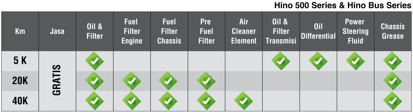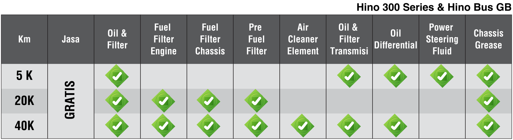 Servis berkala atau perawatan rutin yang dilakukan pada kendaraan Hino Anda, Sesuai dengan buku petunjuk perawatan berkala yang telah diterbitkan, agar kendaraan tetap aman, sehat, dan terawat